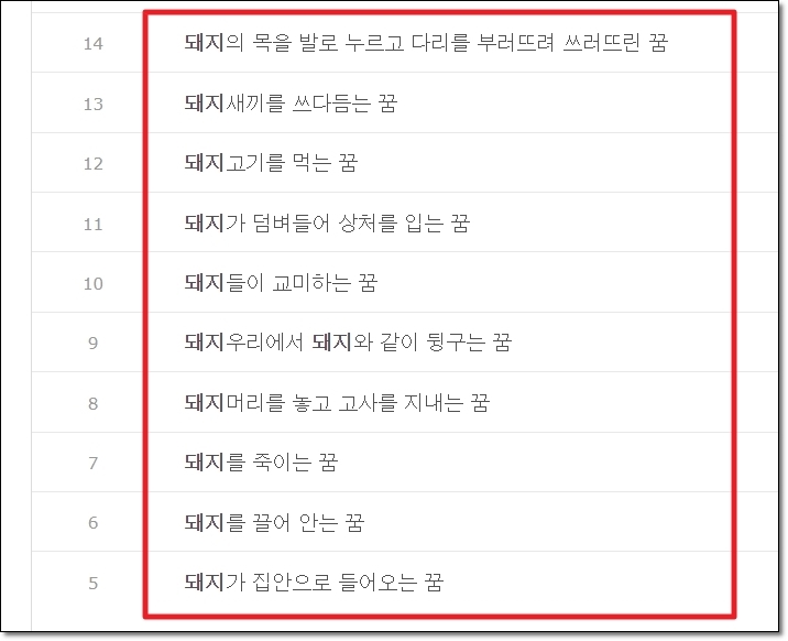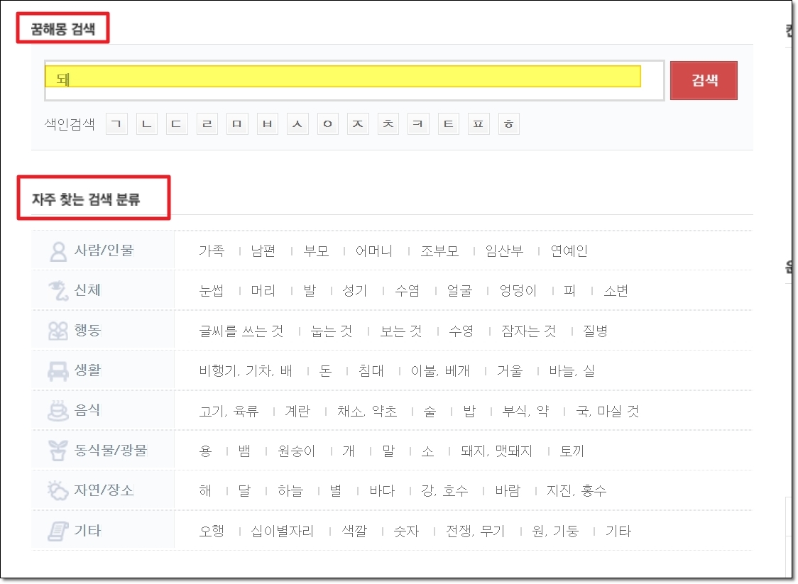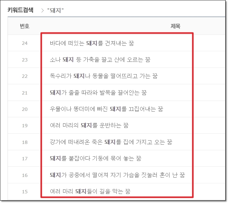 우리가 사용할 기능은 검색 및 검색 분류 인데요. 저는 검색을 통해 꿈해몽 사이트에서 내용을 찾는 것이 편했어요. 그럼 "돼지"를 검색해 보도록 하겠습니다. 검색 분류를 잠깐 보면 아시겠지만, 꽤 다양한 소재를 다루고 있음을 알 수 있어요.