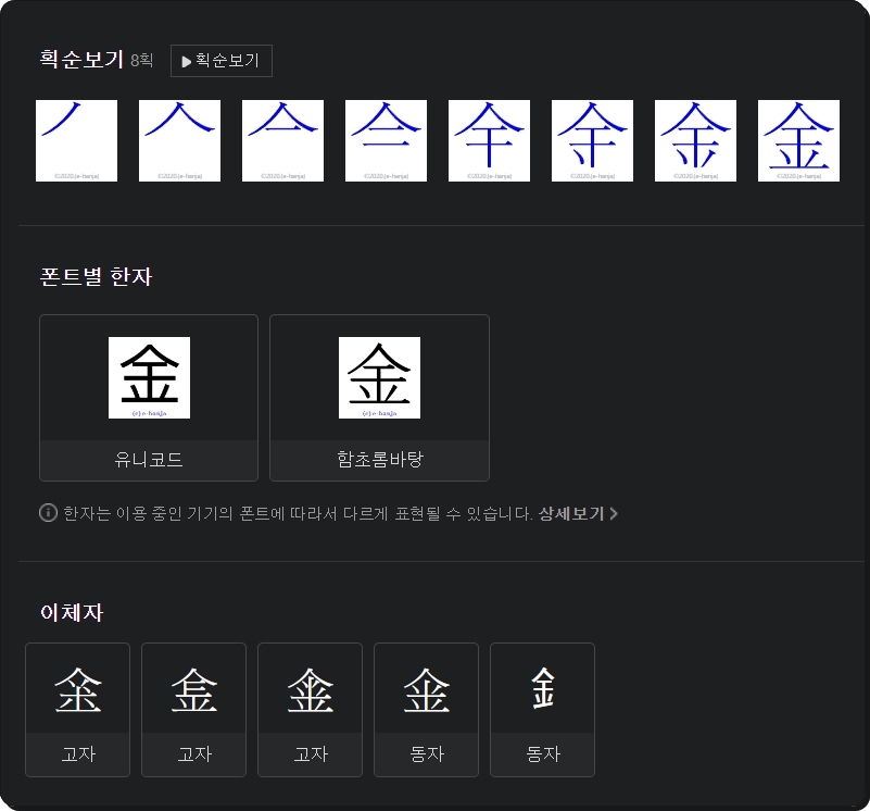 저는 "쇠 금"이라는 한자를 검색했는데요. 이에 관련된 부수, 모양자, 총획수, 유니코드, 난이도, 대법원인명용 여부, 뜻, 연관 단어 등 다양한 사전정보를 얻을 수 있었어요.
