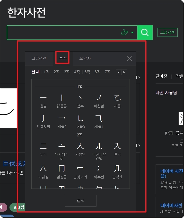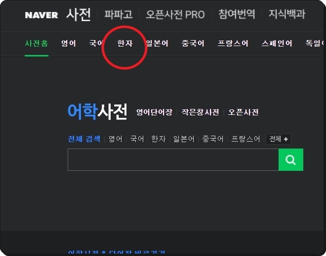 네이버의 사전 사이트에서 통해 한문찾기 서비스를 이용하려면 메뉴에 있는 [한자]를 선택합니다. 떡하니 검색창만 나와서 놀라셨을 텐데요. 검색창 돋보기 옆에 있는 버튼 2개가 핵심입니다.