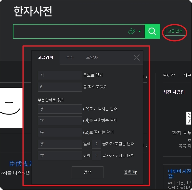 먼저 돋보기 아이콘을 중심으로 왼쪽에 위치한 한자 모양의 버튼을 클릭해 보세요. 그럼 [한자 필기인식기]가 열립니다. 여기에 마우스로 찾고자 하는 한문을 그려 넣으면 돼요. 이번에는 [고급 검색] 버튼을 눌러보세요. 옥편 사용에 익숙한 분들이 한문찾기 진행을 할 때 유용하게 사용할 수 있는 검색기가 나타나요.