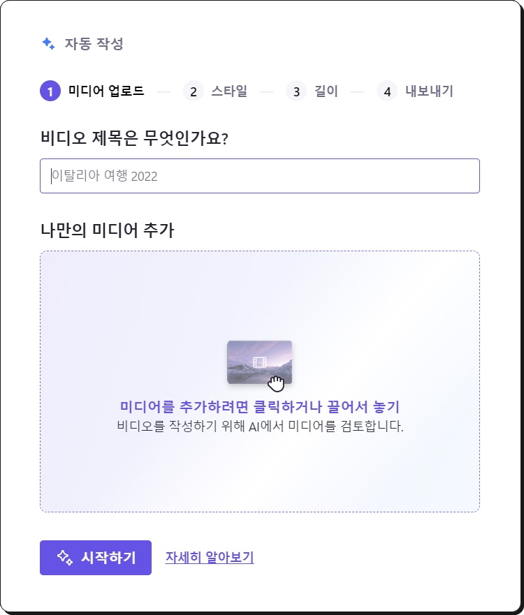 이번 단계에는 사진으로 만들 동영상의 제목을 입력하고, 미디어 소스를 프로그램에 추가하면 됩니다. 어려울 것 없어요. 미디어 소스를 모두 추가했다면 [시작하기] 버튼을 눌러주세요.
