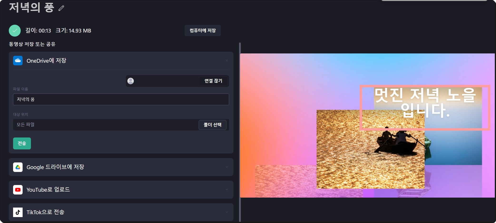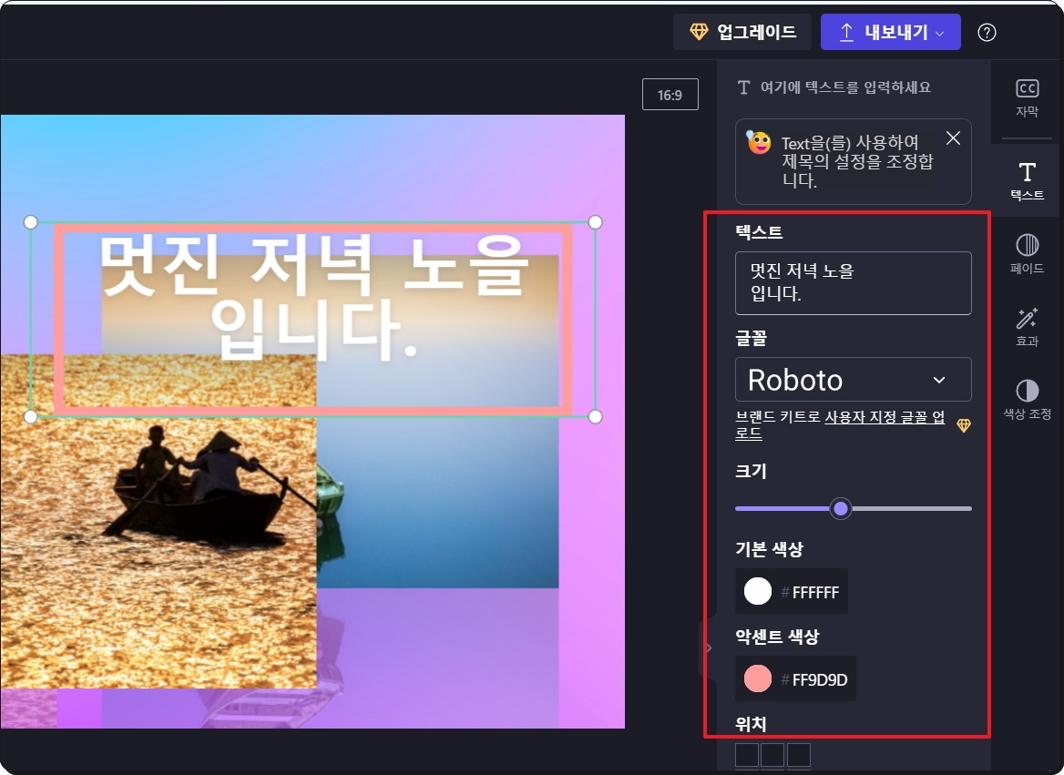 자막을 넣고 싶다면 프로그램 화면에서 맨 좌측에 있는 [텍스트] 버튼을 눌러주세요. 그럼 여러 가지 자막 스타일을 선택할 수 있는데요. 하나를 선택한 후 화면 중앙에 있는 미리보기 화면에 추가합니다. 자막의 내용을 변경하고 싶은 경우에는 프로그램에서 맨 우측에 있는 [텍스트] 버튼을 누른 다음에 내용을 변경해주면 돼요.