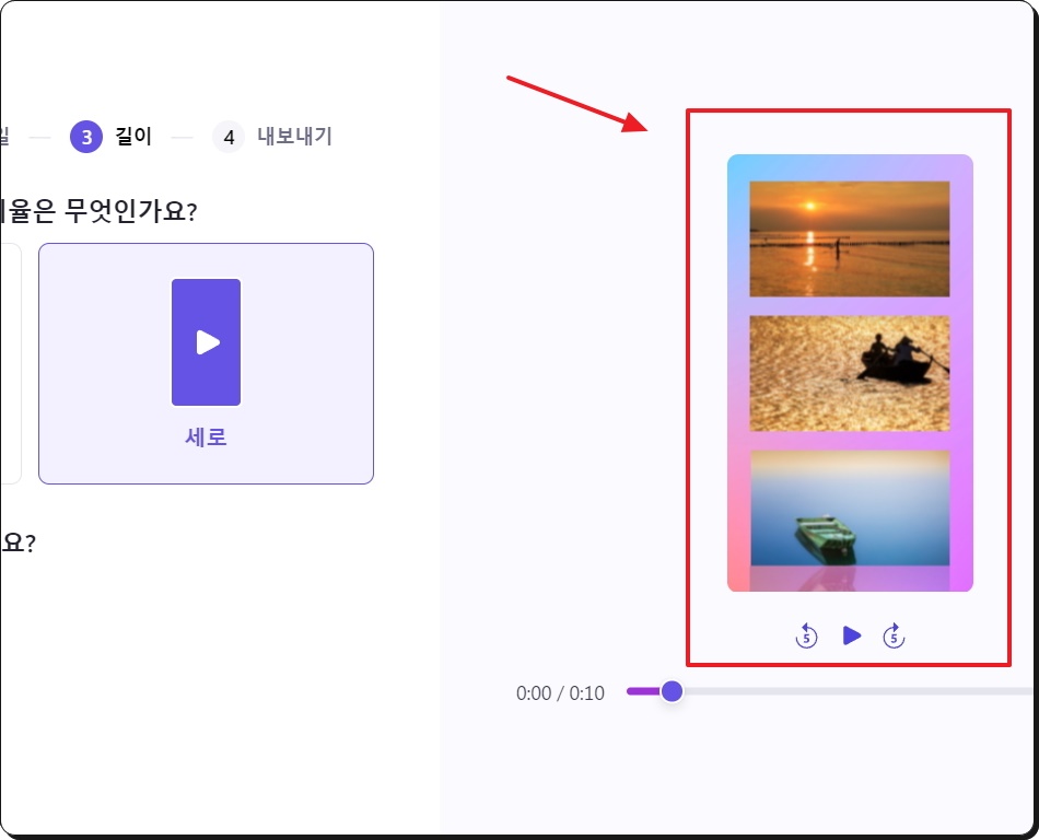 이번에는 동영상의 가로 세로 비율을 지정할 차례인데요. 스마트폰으로 볼 비디오 파일을 만드는 경우라면 "세로" 방식을 사용하면 됩니다. 이번 단계에서는 일부 완성된 결과물을 재생해 볼 수 있는데요. 우측 화면에 있는 플레이어의 재생 버튼을 눌러보세요.