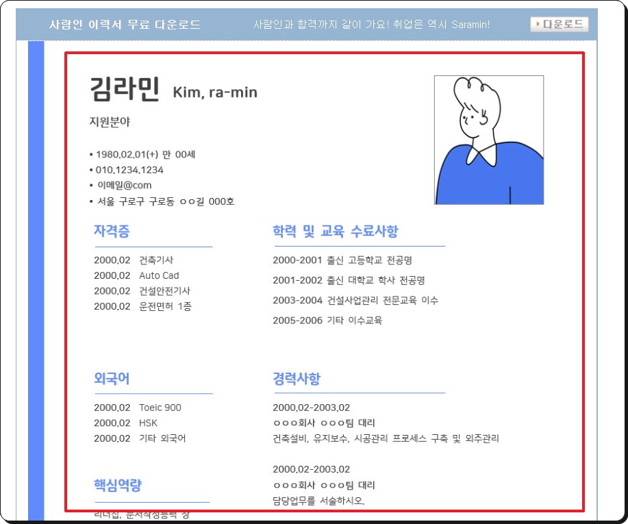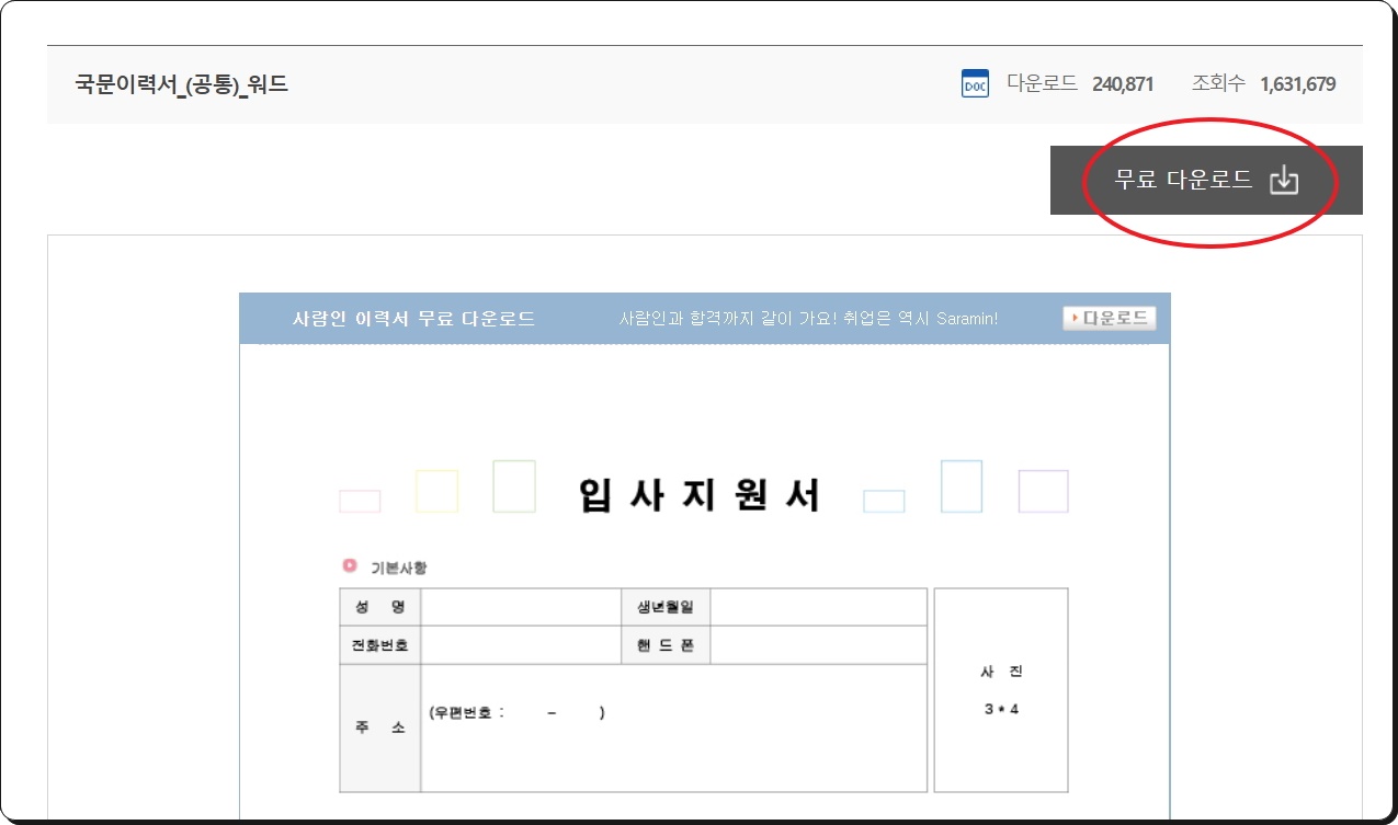 저는 가장 기본이라고 할 수 있는 국문이력서 (공통) 자료를 선택했는데요. 이와 같이 미리보기 화면을 통해 어떤 항목과 스타일로 구성이 되어 있는지 다운로드 받기 이전에 확인할 수 있습니다. 마음에 드는 기본이력서가 필요한 분은 사이트 화면 우측 상단에 있는 [무료 다운로드] 버튼을 누르면 돼요. 앞서 언급한 멋진 디자인으로 되어 있는 자료도 이곳에서 무료로 구할 수 있습니다.