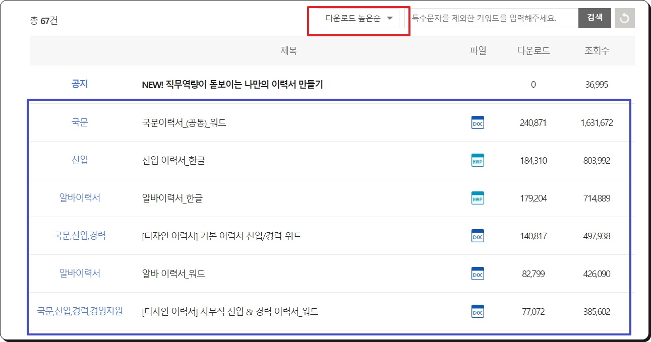 다운 받을 수 있는 자료가 너무 많아서 어떤 것을 선택해야 할지 모를 수 있는데요. 이런 상황이라면 [다운로드 높은 순]으로 정렬을 진행해 보세요. 그럼 사람들이 많이 사용하는 기본이력서 양식을 우선적으로 살펴볼 수 있습니다.