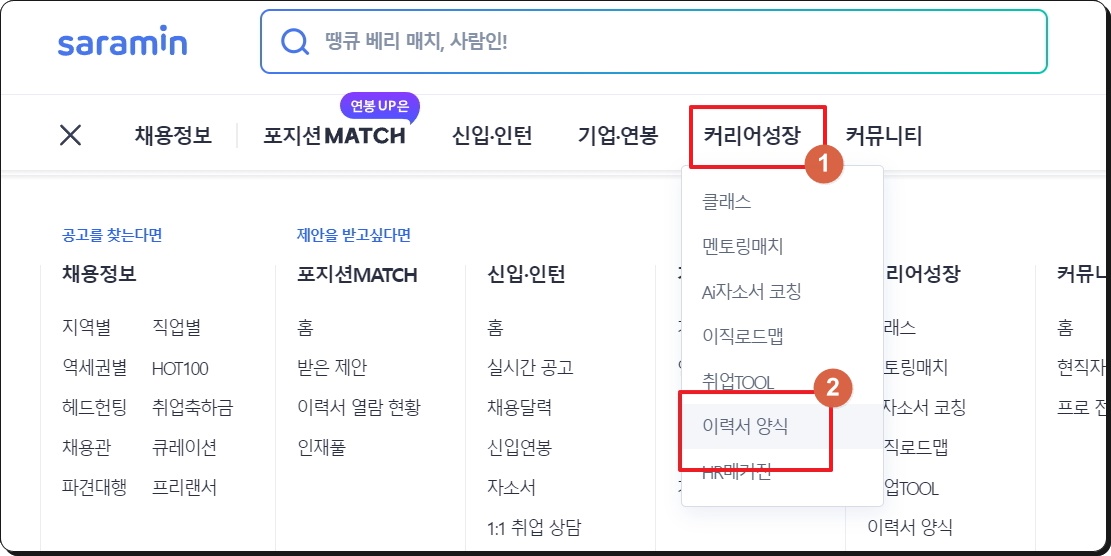 사이트에 접속하면 메인화면에 여러 기업의 채용 공고를 만나볼 수 있을 거에요. 나중에 입사지원을 할 때 사용해보기로 하고, 일단 메뉴에 있는 [커리어성장]과 [이력서 양식]을 차례대로 클릭해 주세요. 요즘에는 AI를 통해 자기소개서를 코칭해주는 서비스도 제공하고 있네요. AI가 다방면으로 잘 쓰이고 있다는 생각이 듭니다.