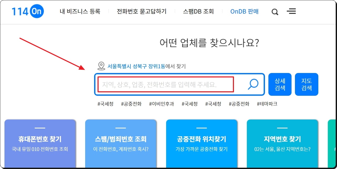 사이트에 접속하면 검색을 할 수 있는 영역이 나타납니다. 여기에 알고 싶은 전화번호를 입력한 후 엔터키를 눌러보세요. 그 대신 지역, 상호, 업종을 입력하여 검색하는 것도 가능합니다. 아래에 보면 휴대폰 번호를 찾는 기능, 스팸 조회, 공중전화 위치찾기 등 다양한 서비스도 제공하고 있습니다.