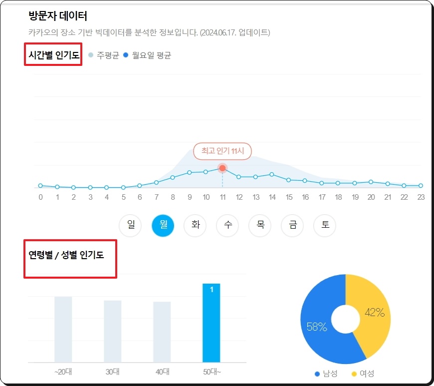 이곳의 경우 이렇게 빅데이터 분석 정보도 제공하고 있는데요. 이를 통해 해당 위치를 방문할 때 유용한 정보를 얻을 수 있습니다, 사람이 분비는 시간을 피하거나 연령 및 성별 이용자 분포를 파악하고 싶을 때 도움이 되겠네요.