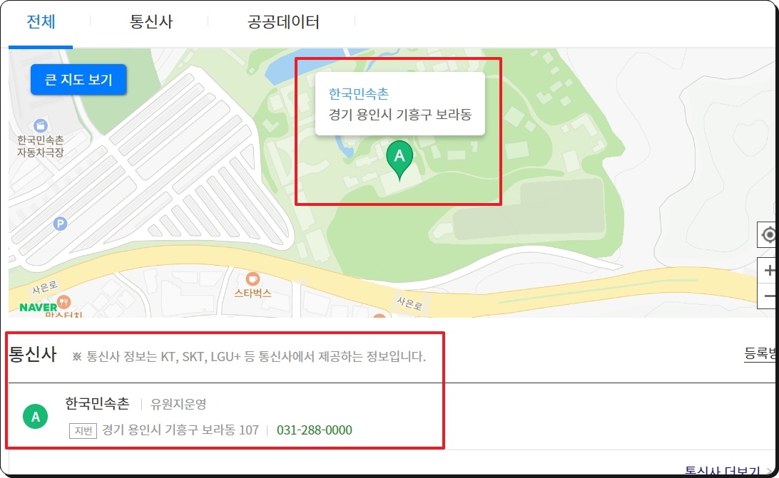 저도 모르는 전화번호 검색을 시도해 보았습니다. 바로 상호명과 상세 주소를 확인할 수 있는데요. 추가적으로 지도 화면이 나타나 어느 위치에 있는지 직관적으로 파악할 수 있도록 되어 있습니다. 추가적으로 통신사 정보도 확인할 수 있다고 하네요.