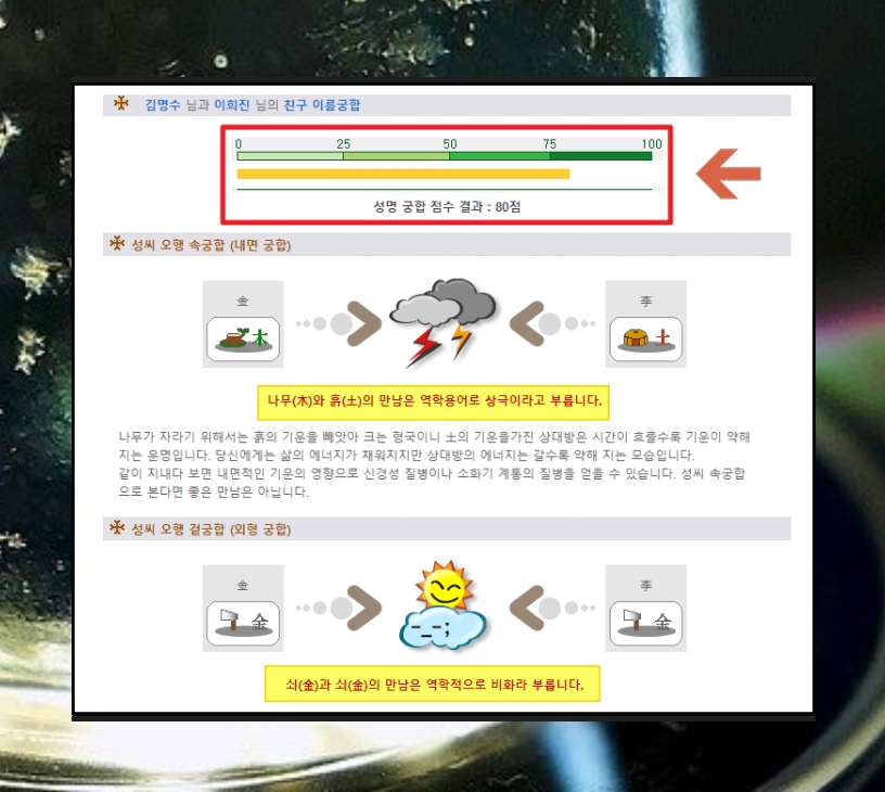 여기서는 외적인 기운을 기준으로 궁합보기 가능한데요. 그 다음으로는 어떤 모습의 관계인지, 특이 사항은 무엇인지 알 수 있습니다. 상대방에게 정신적 그리고 물질적으로 도와주거나 베풀어야 하는 관계라고 하는데요. 좋은 사이를 유지하기 위해서 약간 손해를 감수해도 괜찮다면 관계를 지속해도 될 것 같습니다. 이러한 경우에는 사업적인 만남은 피해야 한다고 하니 이런 부분도 꼭 살펴보아 주세요.