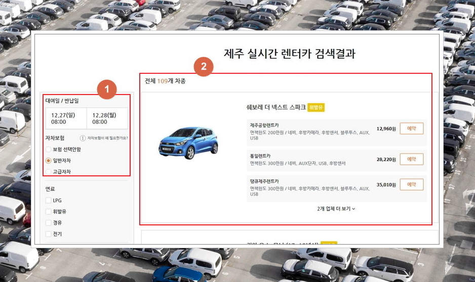 좌측에 있는 메뉴에서 조건을 지정하고 나면 우측 화면에서 여러 업체의 가격과 조건이 나타나는데요. 제주에서 이용할 최저가 렌트카 상품을 찾아보세요. 마음에 드는 조건이 있다면 예약을 진행할 수도 있어요.