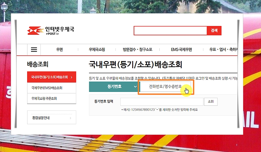 3. 일반적으로 등기 및 소포 우편물의 배송정보 조회를 하기 위해서는 등기 번호를 입력해야 하는데요. 이를 찾기 어려운 경우에는 화면 중앙 상단에 있는 "전화 및 영수증번호" 메뉴를 선택해 보세요.