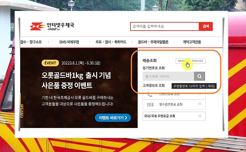 2. 인터넷 우체국택배 홈페이지에 접속하면 메인화면에서 등기번호를 조회하는 검색창이 있습니다. 화면 오른편 상단에 위치해 있는데요. 우편물 번호 13자리를 입력한 후 "돋보기 모양"의 아이콘을 클릭하면 됩니다. 해당 번호를 모르는 경우에는 검색창 위에 있는 MORE 메뉴를 선택해 주세요.