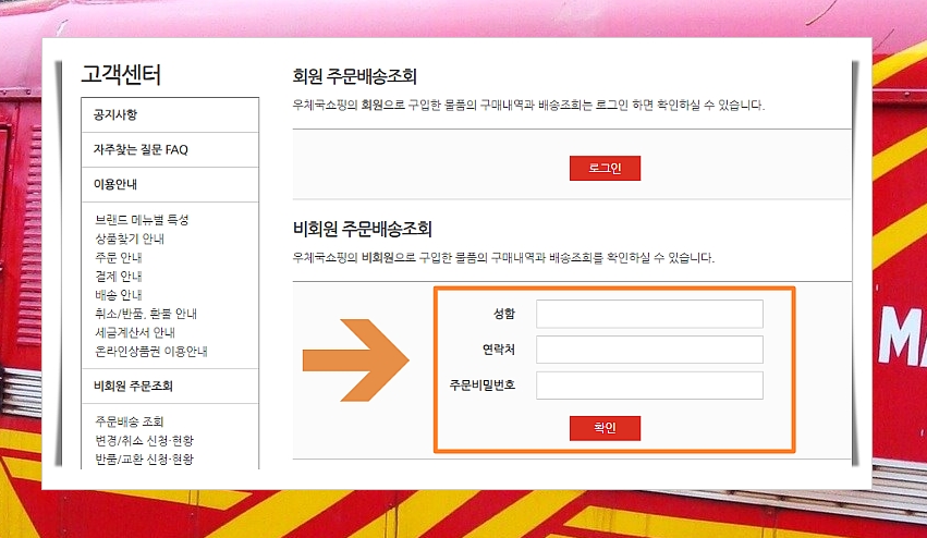 6. 요즘에는 우체국택배 사이트를 통해 쇼핑을 하는 경우도 많은데요. 이러한 경우에는 이전 단계에서 "우체국쇼핑 주문조회" 메뉴를 선택해 보세요. 그럼 성함, 연락처, 주문 비밀번호를 통해 쉽게 배송조회를 할 수 있습니다.