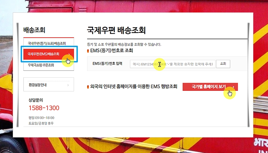 5. 등기 및 소포 우편물이 국제우편(EMS)인 경우에는 좌측에 있는 메뉴에서 "국제우편(EMS) 배송 조회"를 선택해 주세요. 그럼 특정 문자를 제외한 숫자만 입력하도록 되어 있는 EMS(등기) 입력 항목이 나타납니다. 여기에서 번호 입력 후 "조회" 버튼을 누르면 됩니다. 참고로 외국의 인터넷 홈페이지를 이용한 EMS 행방을 조회하고 싶은 경우에는 아래에 있는 "국가별 홈페이지 보기" 버튼을 눌러서 진행하면 돼요.