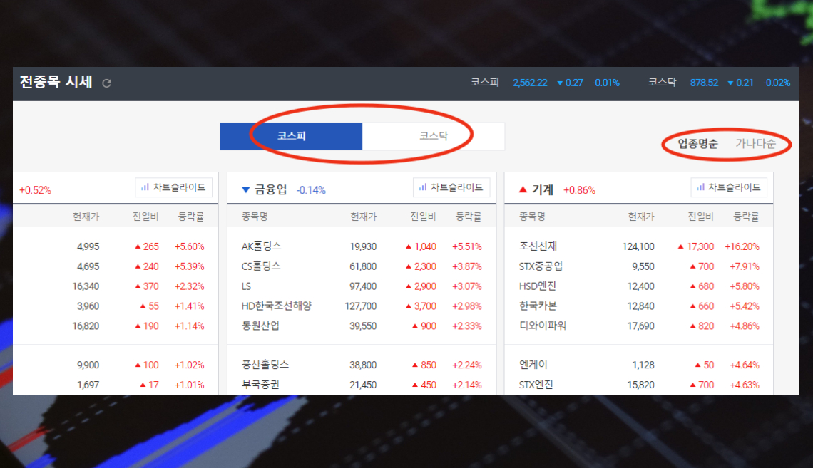 3. 과거 전광판처럼 전종목에 대한 정보를 한눈에 볼 수 있는 다음증권 주식시세표가 나타났습니다. 해당 표는 코스피와 코스닥에 있는 모든 종목에 대한 시세를 알아볼 수 있는데요. 특정 업종에 대한 전체적인 흐름을 조회해 볼 수 있어서 편리합니다.