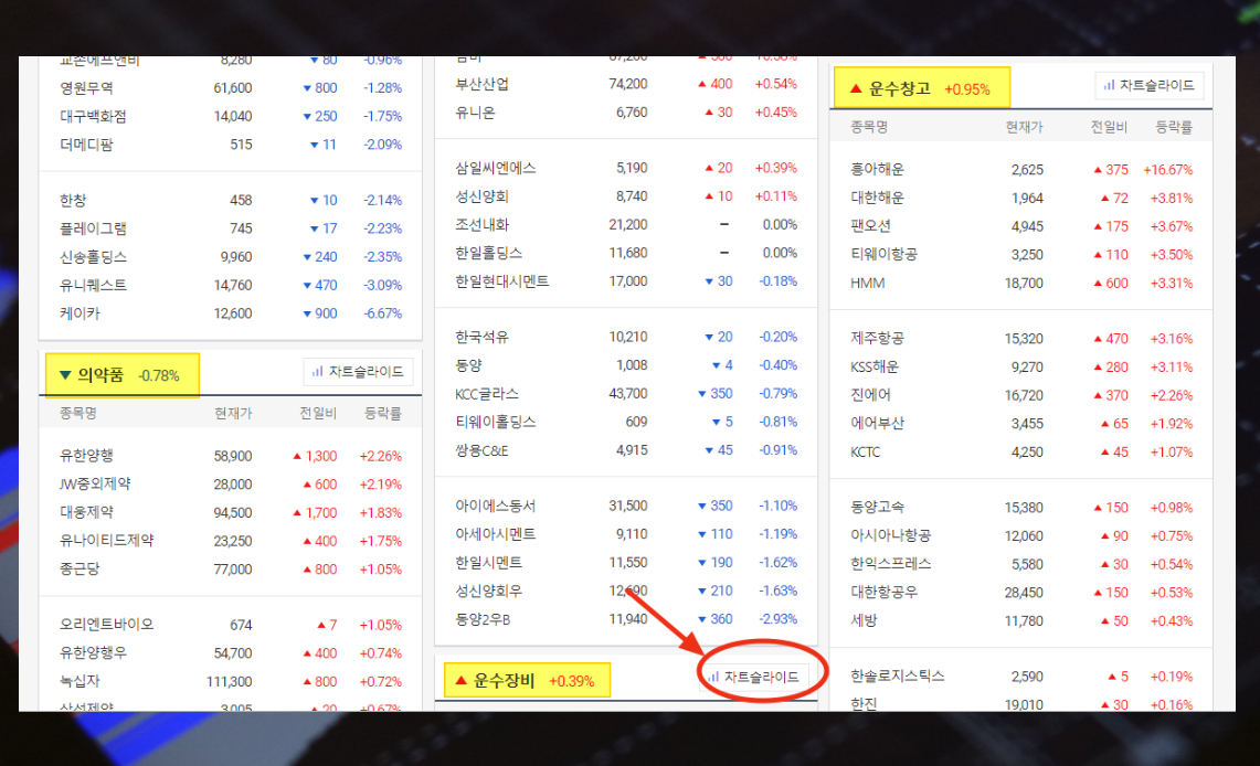 4. 각 업종 옆에 있는 차트슬라이드 버튼을 클릭해 보세요.