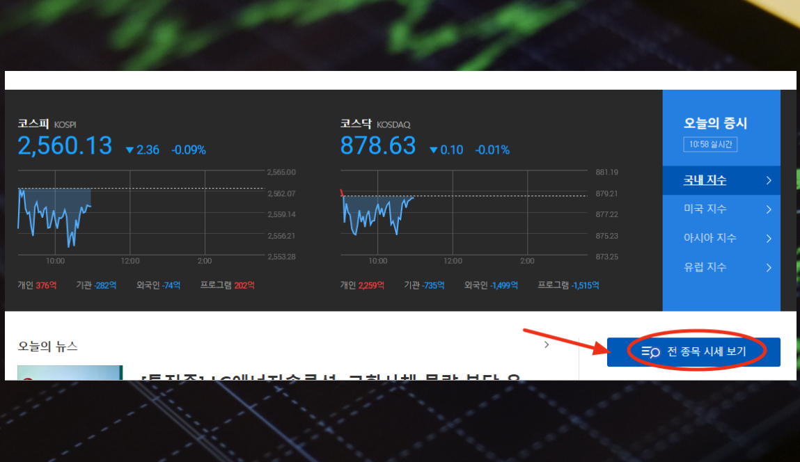 2. 주식 시장에 전종목에 대한 시세를 보기에 앞서 지수를 확인하시기 바랍니다. 코스피와 코스닥 지수를 통해 국내 증권 시장이 어떤 흐름을 보이고 있는지 매일마다 알 수 있죠. 금일은 약보합의 형태를 띠고 있는데요 기관과 외국인이 팔고 개인이 매수하는 경향을 보이네요. 해외 지수까지 간단히 확인한 후 우측 하단에 있는 전종목시세 보기 버튼을 클릭해 주세요.
