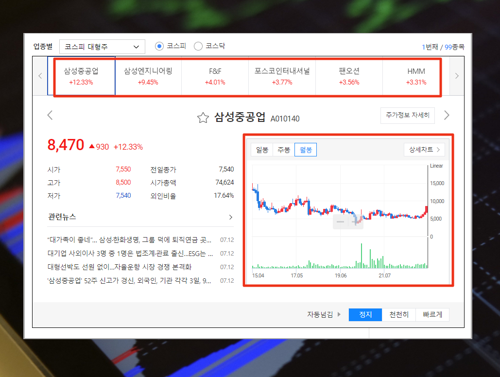 5. 저는 다음 증권의 차트 슬라이드를 자주 사용합니다. 관심 있는 업종에 포함된 전 종목에 대한 주식 시세 흐름을 보기에 좋거든요.