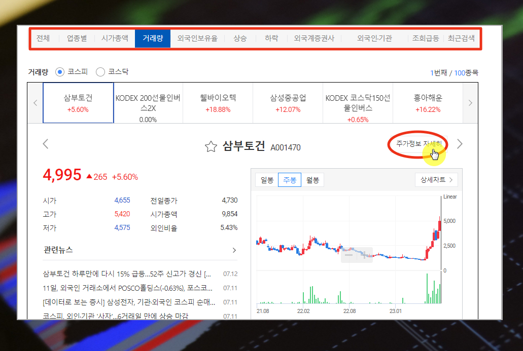 7. "주가정보 자세히" 버튼을 클릭하면 개별종목에 대한 주식시세표를 만나볼 수 있는데요 투자정보나 외국인 비율, 시가총액 등 여러 가지 중요한 지표를 조회할 수 있습니다.