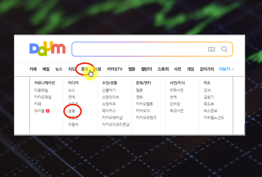 1. 다음 사이트에 접속해 습니다. 보통 검색 서비스를 많이 이용하는데요. 메뉴에 보면 여러가지 서비스를 다양하게 제공하고 있습니다. 이 중에서 다음 증권의 경우는 다섯 번째 메뉴를 선택하면 돼요.