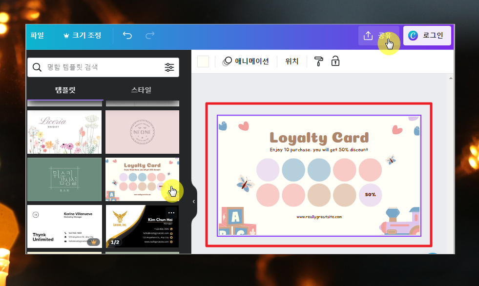 9. 나만의 디자인을 완성했다면 프로그램에서 공유 메뉴를 선택해 주세요. 그럼 다운로드 받은 버튼을 찾을 수 있습니다.