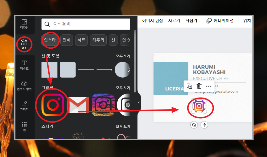 7. 메뉴에서 요소를 선택해 보세요. 그럼 여러가지 도형이나 클립아트, 선 등의 요소를 추가할 수 있습니다. 명함에 인스타그램 주소를 넣으려고 할 때 인스타그램 아이콘을 넣으면 사람들이 쉽게 인식할 수 있을 거예요.