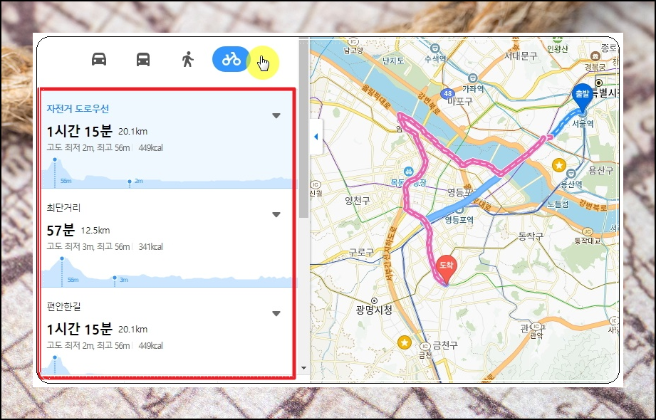 요즘 제가 자전거를 많이 타고 있는데요. 이렇게 자전거 아이콘을 선택하면 자전거 도로우선, 최단거리, 편안한길 이렇게 3가지로 길을 알려줍니다. 전화번호로 찾은 주소를 방문하고자 할 때 유용한 기능입니다.