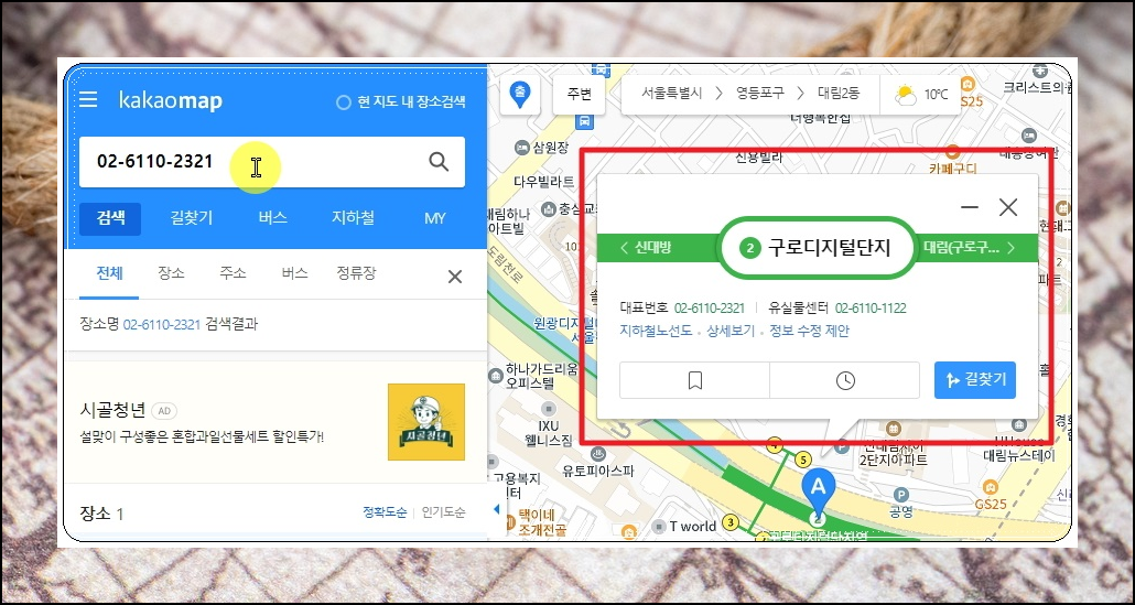 보통 많은 분들이 카카오맵 지도 사이트를 이용할 때 건물이나 가게의 명칭을 입력하는데요. 여기에는 전화번호로 입력하는 것도 가능합니다. 주소찾기 원하는 곳의 전화번호를 입력해 보세요. 저도 한 곳 입력했는데요. 이에 따라 우측 지도화면에 해당 전화번호를 가진 기관 또는 가게가 나타났습니다. 상세보기 버튼을 누르면 좀 더 상세한 주소를 확인할 수 있죠.