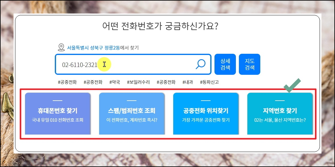 114on 사이트에 접속했습니다. 화면 중앙에 있는 검색창에 전화번호를 입력해 보세요. 그 다음 상세검색 또는 지도검색 버튼을 누릅니다. 검색창 아래에 보면 휴대폰 및 지역번호 찾기, 스팸 조회, 공중전화 위치찾기 등의 서비스도 제공하고 있음을 알 수 있습니다.