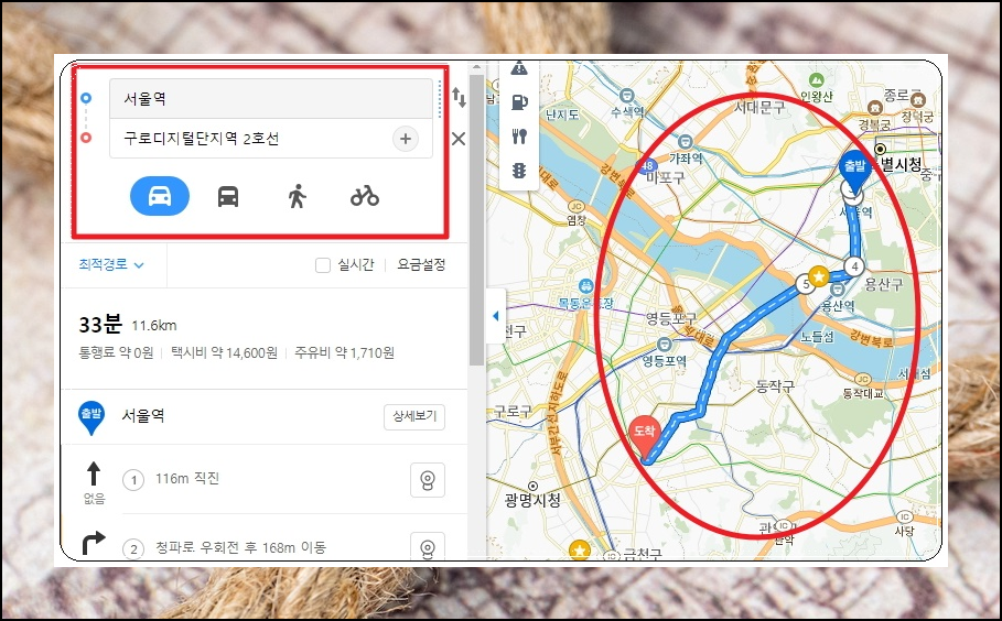 [도착] 버튼을 누르면 위와 같은 화면이 나타나는데요. 여기에서 출발하는 곳의 명칭이나 주소를 입력해 주세요. 그럼 출발하는 곳과 도착하는 곳 사이에서 어떻게 찾아갈 수 있는지 알려줍니다. 자가용, 대중교통, 도보, 자전거 이렇게 4가지로 구분이 되는데요. 자가용을 선택하면 걸리는 시간, 거리, 택시비, 주유비 내용도 확인이 가능합니다.