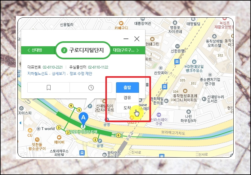 해당 주소찾기 및 방문을 하려고 할 때에는 [길찾기] 서비스를 이용해 보세요. 해당 메뉴를 선택한 후 [도착] 버튼을 누릅니다.