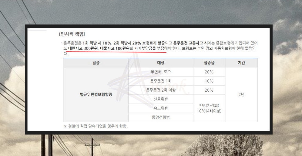 앞서 언급한 음주운전 면허취소 벌금 외에도 형사, 민사, 행정상 다양한 책임을 져야 해요. 일단 음주운전에 적발되면 보험료가 할증이 되고요. 대인사고나 대물사고가 발생했을 때에는 자기부담금을 부담해야 해요. 벌금은 아니지만, 부담해야 되는 부분이죠.