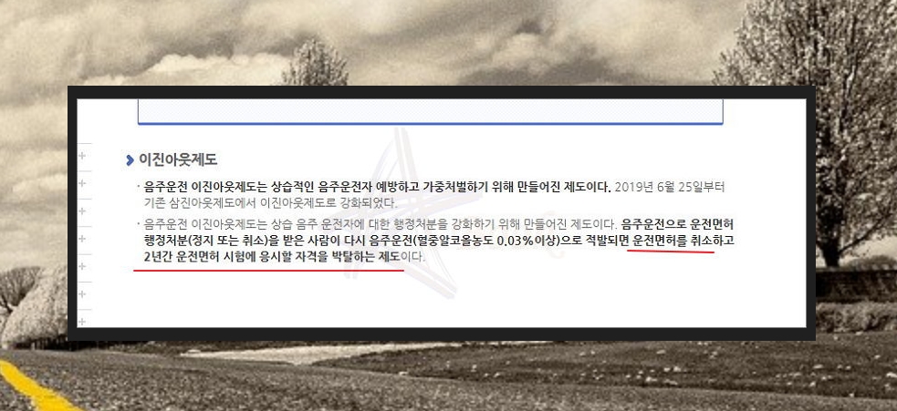 상습적으로 음주운전을 하는 경우에는 면허취소를 받는 것은 물론이고, 2년간 운전면허 시험에 응시할 수도 없어요. 이진아웃제도라고 하는데요. 한 잔의 술이 이렇게 무섭습니다. 더 무서운 것은 나, 우리 가족, 주변 사람들 모두 위험할 수 있다는 거에요. 이점 잘 숙지하셔서 세이프 드라이빙 하시길 바래요.