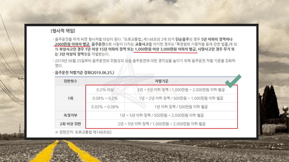 가장 기본적으로 아셔야 할 것이 있어요. 바로 운전을 하면 안되는 술에 취한 상태의 기준인데요. 혈중 알코올 농도가 0.03% 이상인 경우면 여기에 해당이 돼요. 이 정도 수치는 사람에 따라 다른데요. 한 잔의 술을 마신 경우에도 해당이 될 수 있어요. 한 잔의 술로 인해 교통사고가 발생율이 높아지기 때문이에요. 알코올 농도가 0.08% 이상인 경우에는 면허취소가 되고요. 2000만원 이하의 벌금이 발생해요.