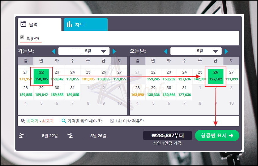 태국행 항공편의 5월 가격입니다. 동일한 노선이라도 날짜와 비행시간에 따라 금액이 달라지는데요. 대체적으로 목금토에 출발하는 항공편이 비싼 편입니다. 반대로 일월화에 출발하는 티켓이 저렴하죠. 그럼 태국으로 가는 항공편 달력에서 녹색으로 된 최저가를 지정한 후 '항공편 표시'를 클릭해 보겠습니다.
