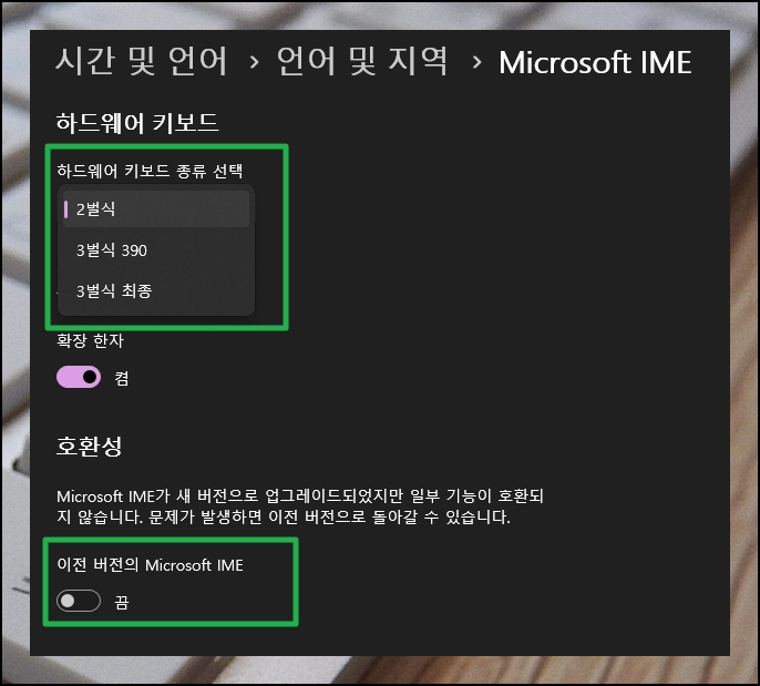 4. 이제 본격적으로 노트북 키보드 자판 오류를 해결하도록 하겠습니다. 문제를 해결함에 있어서 버튼 입력이 필요한 경우가 있어서 화상키보드를 설치했던 것이에요. 그럼 작업 표시줄에 있는 "A" 혹은 "가" 아이콘에 마우스 우클릭을 해보세요. 그럼 노트북의 하드웨어 키보드 종류를 선택할 수 있는데요. 여기에서 자신의 노트북에 맞는 것을 선택하면 됩니다. 또는 Microsoft IME에 관하여 호환 문제가 있을 때 자판 오류가 발생하기도 하는데요. 호환성 부분에 체크를 하면 해결될 수 있습니다.