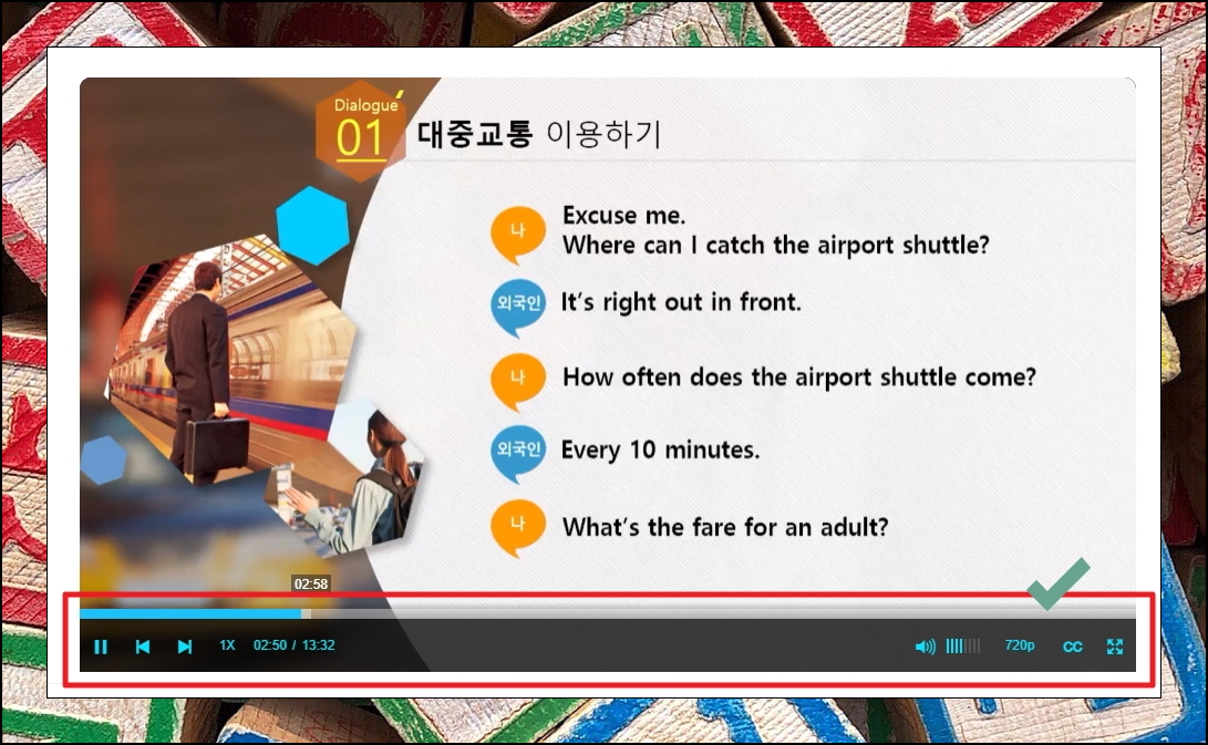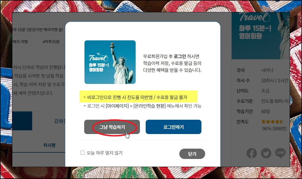 강좌를 이용할 때에는 로그인을 해도 되고, 로그인을 하지 않아도 됩니다. 로그인을 하는 경우에는 진도 이력을 저장하거나 수료증을 발급 받을 수 있어요. 그러한 혜택이 필요하지 않고, 그저 영어회화 공부 혼자하기 목적이라면 [그냥 학습하기]를 눌러주세요. 그럼 해당 글 처음 단계와 같이 시청각 자료를 이용할 수 있습니다.
