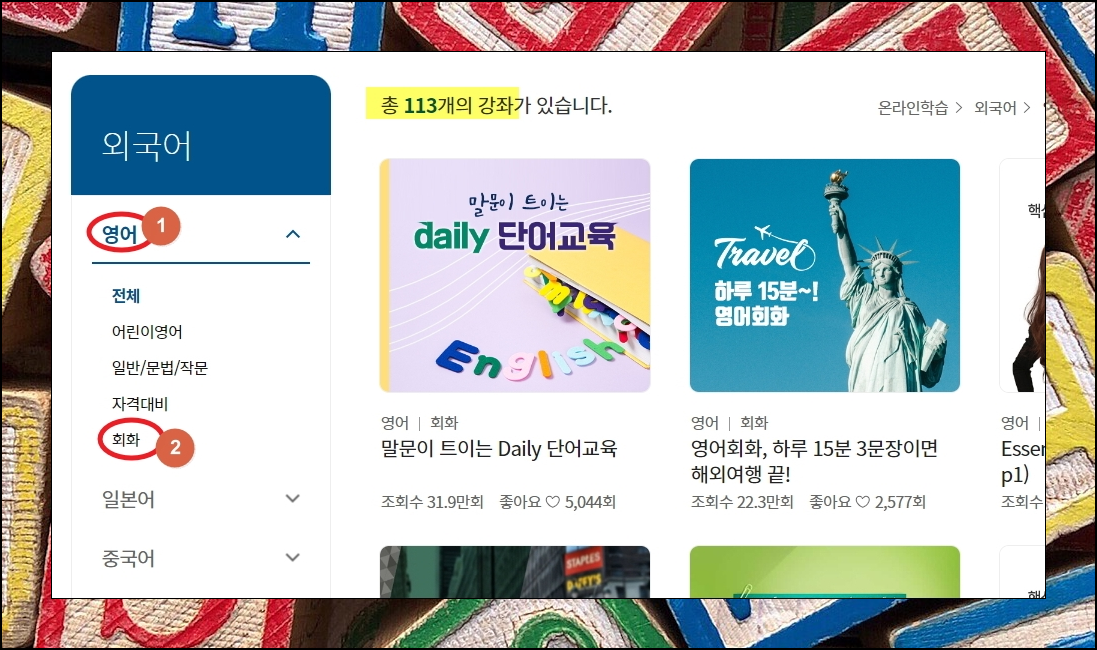 리스트를 보면 영어, 일본어, 중국어 등 여러 나라의 언어를 배울 수 있게 되어 있는데요. 여기에서 영어 강의만 113개나 있습니다. 문법, 작문, 자격증 관련 학습도 받아볼 수 있죠. 좌측에 있는 메뉴에서 [영어회화]를 선택해 보겠습니다.