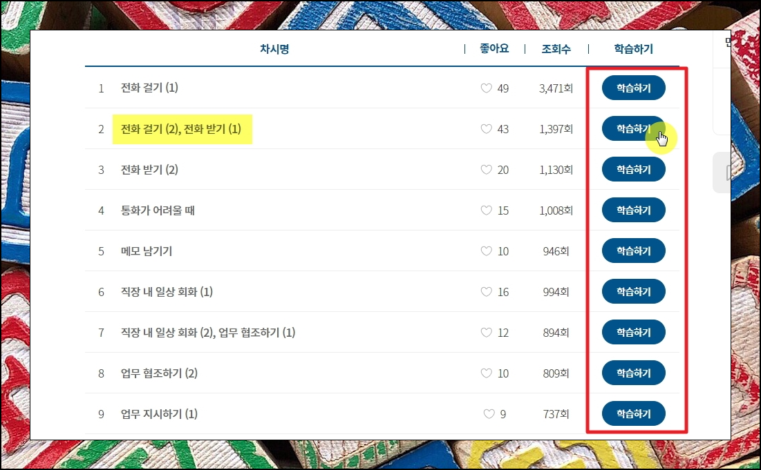 영어회화 강좌를 이용할 때에 꼭 처음부터 끝까지 들을 필요는 없습니다. 목차를 눌러보면 각 차시마다 무엇을 배우는지 알 수 있는데요. 목차에서 [학습하기]를 누르면 듣고 싶은 차시만 골라서 들을 수 있어요. 그럼 제가 알려드린 방법을 통해 효과적인 공부 혼자하기 성공을 기원합니다.