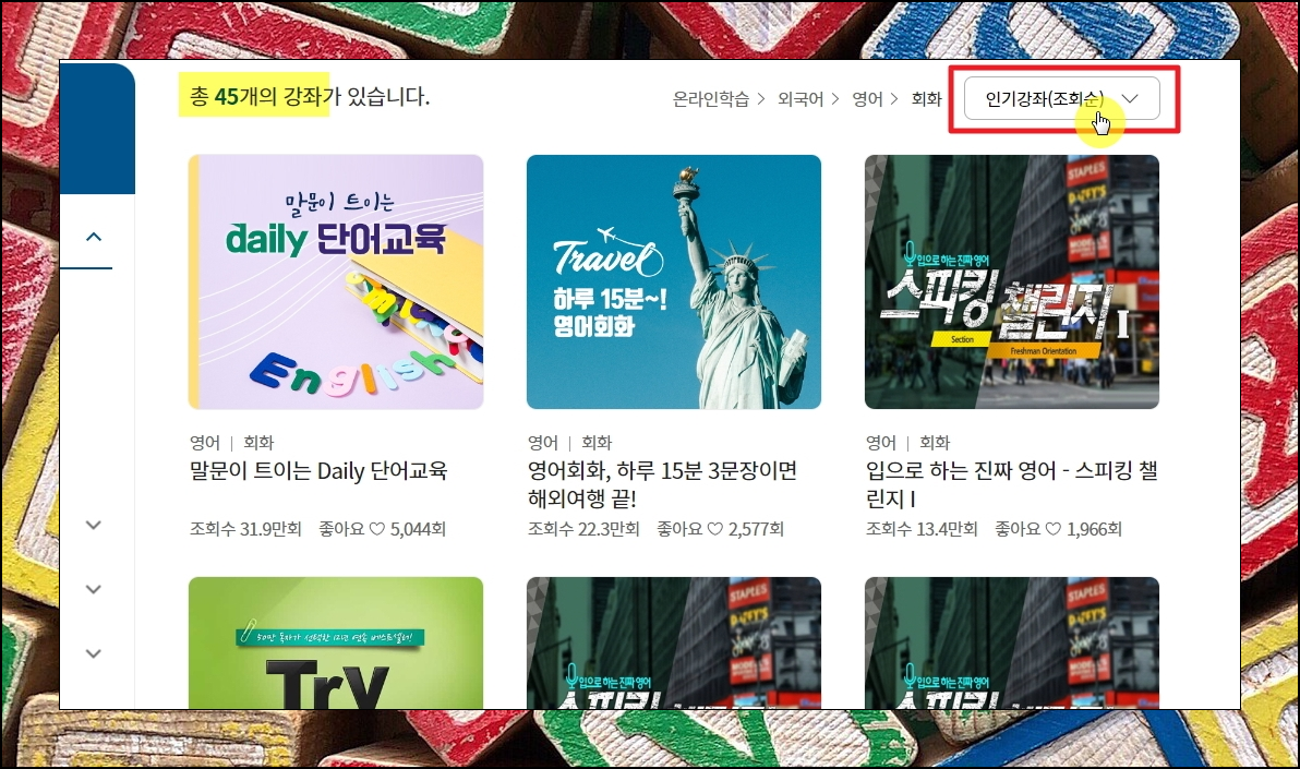 혼자 공부하기 좋은 강좌가 45개나 나타났는데요. 어떤 것을 선택해야 할지 모르겠다면 선택에 대한 좋은방법을 알려드리겠습니다. 바로 정렬 기능을 사용하는 것인데요. 강의 목록 페이지에서 우측 상단에 보면 정렬 기능을 찾을 수 있습니다. 여기에서 [인기강좌]를 선택해 주세요. 그럼 사이트 이용자들이 많이 선택한 강의 순으로 정렬이 가능합니다.
