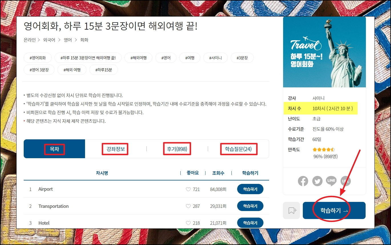 강좌를 하나 선택해 보겠습니다. "영어회화, 하루 15분 3문장이면 해외여행 끝!"이라는 강좌를 선택했는데요. 총 10차시로 구성되어 있고, 총 시간이 2시간 10분이네요. 목차, 강좌정보, 후기, 학습질문 이렇게 4가지 관련 정보도 제공하고 있으니 한 번 이용해 보세요. 우측 하단에 보면 [학습하기] 버튼이 있는데요. 해당 버튼을 눌러 수업을 들어볼 수 있습니다.
