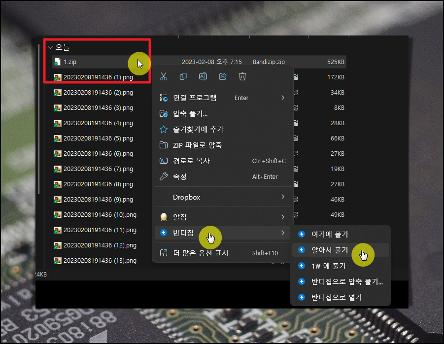 이 경우에도 마우스 버튼을 몇 번만 클릭하면 될 정도로 쉬운 방버을 알려드리겠습니다. 내 컴퓨터에서 zip 파일에 마우스 우클릭을 합니다. 그럼 반디집 관련 메뉴가 여러 가지 나타나는데, 여기에서 [알아서 풀기]를 선택합니다.