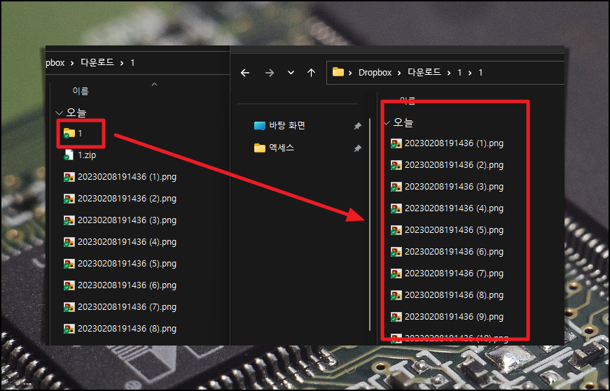 이와 같이 파일의 이름으로 된 폴더가 하나 생성이 되는데요. 여기에 압축 파일에 들어있던 데이터가 들어 있음을 확인할 수 있습니다.