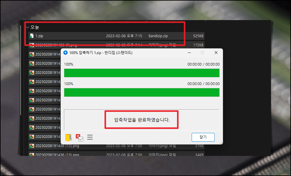 방금 압축을 진행한 결과 확장자가 zip으로 되어 있는 파일이 생성 되었습니다.