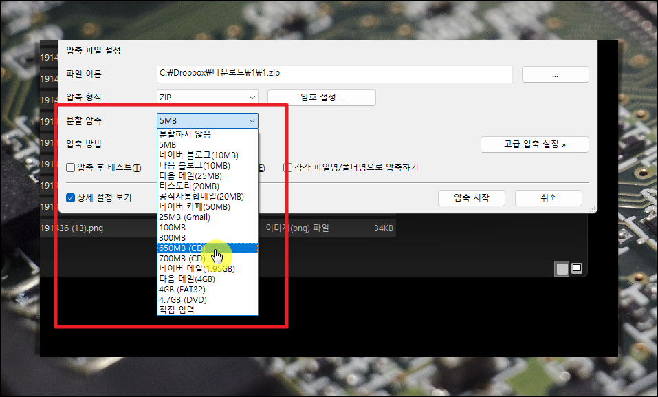 프로그램 창에서 [상세 설정 보기] 버튼을 클릭해 보세요. 그럼 분할 압축에 관련된 여러 가지 설정 버튼이 나타납니다. 여기에서 원하는 크기를 선택한 후 [시작] 버튼을 누르면 됩니다. 블로그, 메일, 티스토리, CD 등 여러 용도에 맞는 데이터의 크기를 정할 수 있습니다.