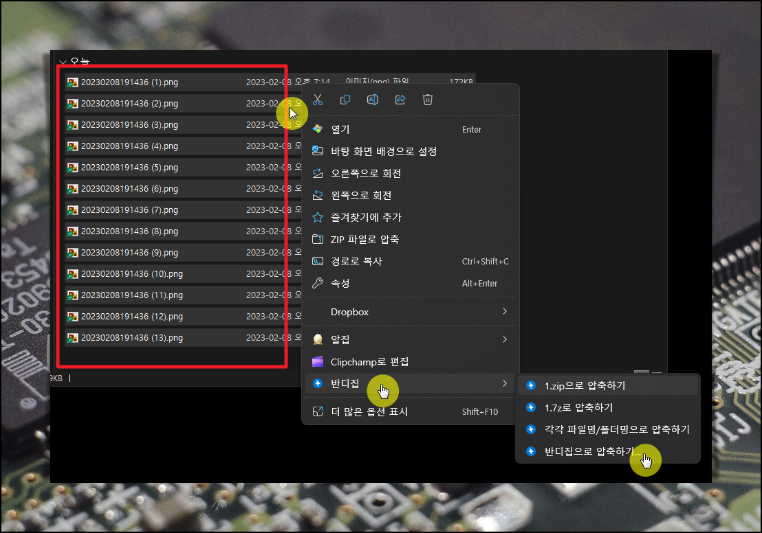 그럼 이미지 파일 13개를 가지고 압축하는 방법을 알려드리겠습니다. 위와 같이 내 컴퓨터를 열고, 대상이 되는 파일을 드래그 한 후 마우스 오른쪽 버튼을 눌러보세요. 반디집 프로그램일 설치가 되어 있는 상태라면 관련 메뉴가 나타날 겁니다. 여기에서 [반디집으로 압축하기]를 선택합니다.