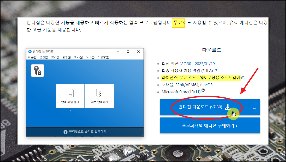 사이트에 접속하면 메인화면에 [반디집 다운로드] 버튼이 있습니다. 해당 버튼을 눌러 다운 받은 프로그램을 실행하면 반디집을 내 컴퓨터에 설치할 수 있습니다. 라이선스 부분을 보면 무료로 사용할 수 있다고 해요. 그러니까 부담 없이 압축하는 용도로 사용하면 됩니다.