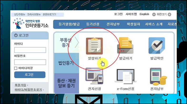 홈페이지 메인화면을 보시면 부동산 등기, 법인등기, 동산 및 채권 담보등기가 나오는데요. 토지등기부등본 무료열람을 위해서 부동산 등기에 있는 열람하기 버튼을 클릭하시면 됩니다.