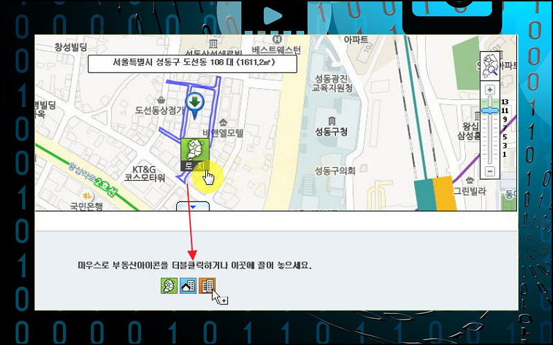 저는 서울시 성동구 도선동에 위치한 곳을 살펴보았습니다. 토지 아이콘이 나타나는데요. 이것을 더블클릭하거나 아래쪽으로 끌어 놓으세요.